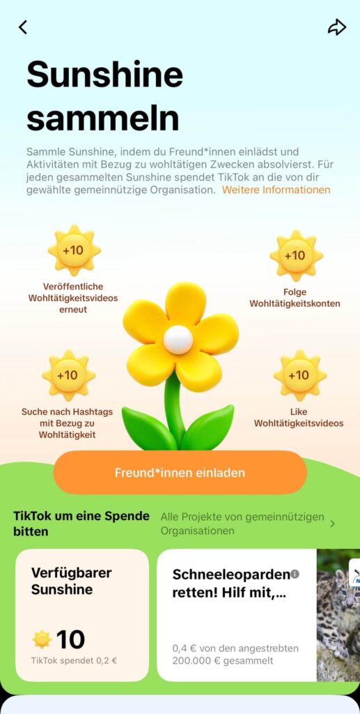 Das ist der Fakt, den fast alle deutschen Artikel bisher unterschlagen haben: TikTok spendet 2 Euro für je 100 gesammelte Sunshine-Punkte an die Wohltätigkeitsorganisation deiner Wahl: wie 20 Minuten als eines der ersten Medien berichtete. Das Geld kommt komplett von TikTok, nicht von dir oder deinen Freunden. Du wählst lediglich aus einer Liste, welche Organisation den Betrag erhält.