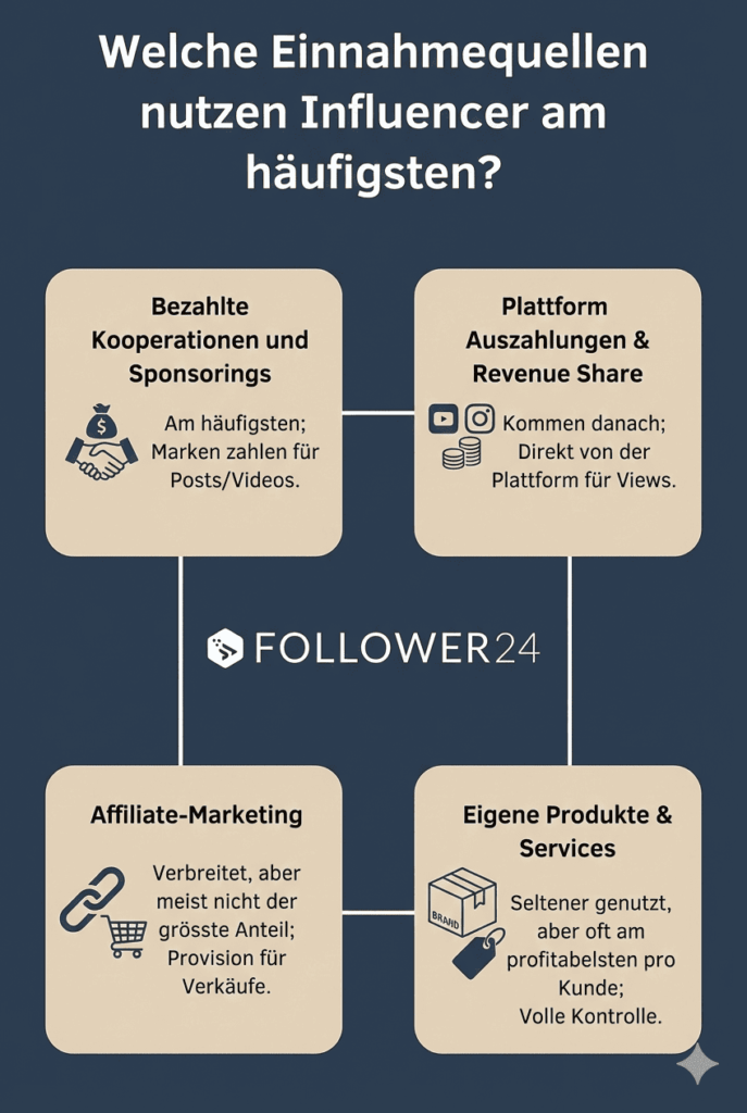Am häufigsten sind bezahlte Kooperationen mit Marken, also Sponsorings und gesponserte Posts. Danach folgen Affiliate Einnahmen, Plattform Vergütungen wie Werbeerlöse oder Creator Programme und bei fortgeschrittenen Creatorn eigene Produkte oder Services. In der Praxis kombinieren viele zwei Quellen, zum Beispiel Brand Deals plus Affiliate oder Plattform Einnahmen plus eigene Angebote.