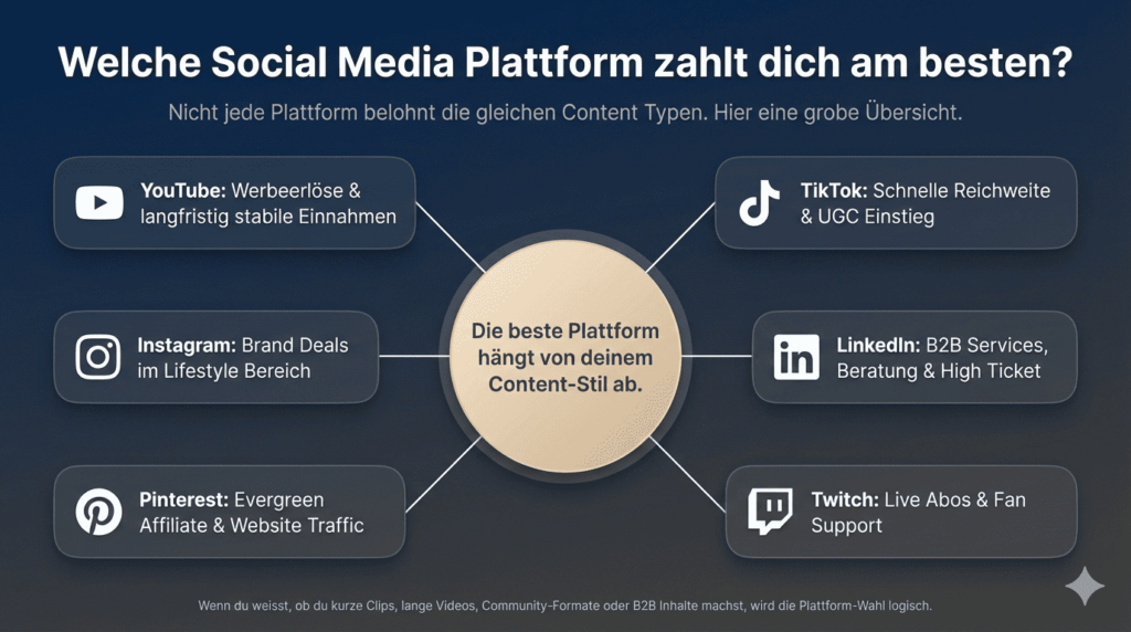 Es gibt keinen Gesamtsieger, weil jede Plattform andere Content Typen belohnt. YouTube ist oft am stärksten bei Werbeerlösen und langfristig stabilen Einnahmen, TikTok ist stark für Reichweite und UGC, Instagram für Brand Deals und Community Verkäufe, LinkedIn für B2B Services und High Ticket, Pinterest für Evergreen Traffic und Affiliate, Twitch für Live Abos und Fan Support. Die beste Plattform ist die, die zu deinem Stil passt.